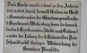 Die Petruskirche in Pleinfeld wurde in den Jahren 1883/84 errichtet. Damit ist sie im Vergleich zu vielen altehrwürdigen Gotteshäusern in der Region recht jung. Mit Blick auf die Geschichte der Evangelischen in Pleinfeld ist sie jedoch regelrecht alt. Erst mit dem Anschluss Pleinfelds an das Eisenbahnnetz im Jahre 1849 siedelten sich vermehrt Bahnbedienstete protestantischer Konfession in dem bis dahin rein katholischen Ort an. So zählte man etwa im Jahr 1874 in Pleinfeld insgesamt 64 Erwachsene und 47 Kinder evangelischen Glaubens. Den Wunsch nach einem gottesdienstlichen Leben vor Ort belegt das „Gesuch des Komitees auf Einrichtung protestantischer Gottesdienste in Pleinfeld“ vom 29. Oktober 1874, gerichtet an das „Königliche Oberkonsistorium in München“. Für die daraufhin genehmigten 13 Gottesdienste im Jahr stellte der Markt Pleinfeld einen Betsaal im ehemaligen Landgerichtsgebäude (sog. „Kloster“) zur Verfügung. Neun Jahre später strebte man bereits nach einem eigenen Gotteshaus. Dem kam die Marktgemeinde Pleinfeld entgegen, indem sie kostenlos ein Grundstück zur Verfügung stellte. 1883 erfolgte die Grundsteinlegung; die Einweihung der Kirche fand am 28. September 1884 statt. Eine Gedenktafel auf der linken Seite des Innenraums weist darauf hin, dass die Realisierung des Kirchenbaus nur über Spenden bzw. durch Eigenleistungen möglich war. Dabei erfuhren die Evangelischen auch viel Unterstützung von den übrigen Pleinfeldern. Bis heute erzählt man sich im Ort, wie die Steine zum Bau der Kirche auch von Katholiken mit Pferdefuhrwerken aus den Steinbrüchen herbeigeschafft wurden. Errichtet wurde in der kurzen Bauzeit eine Hallenkirche in neugotischem Stil mit mehr als 120 Plätzen. Die lichterfüllte und freundliche Atmosphäre, welche die Besucher sofort in ihren Bann zieht, verdankt die Kirche den großen Spitzbogenfenstern und den hellen Wänden. Das Gestühl, der Altar und die Kanzel sind einheitlich in einem dunklen, warmen Türkiston gehalten. Bald nach der Einweihung erhielt die Gemeinde auch die staatliche Genehmigung, in der neuen Kirche Taufen, Trauungen und Konfirmationen zu feiern, und der modern anmutende Taufstein aus Kalksandstein wurde aufgestellt. Er steht in der Mitte der Kirche, am Ende des Mittelgangs vor dem Altarraum. Seine zentrale Position betont die zentrale Bedeutung des Taufsakraments. Anfang der siebziger Jahre wurde die Petruskirche renoviert. Dem damals nüchternen Geschmack entsprechend wurde die Deckenmalerei unter einer abgehängten Decke versteckt und die beiden Bilder von Luther und Melanchthon sowie der Kronleuchter wurden entfernt.